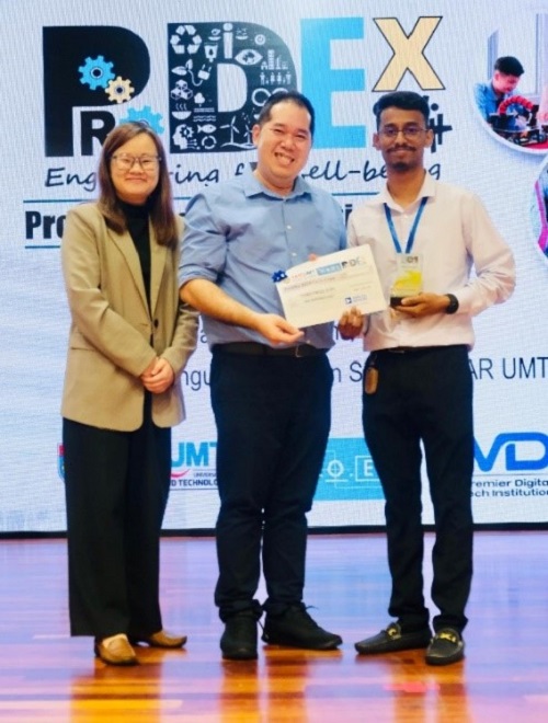 Thinesh (right) receiving the 'Most Viewed' award from Danes Ooi, an external judge from Analog Devices Malaysia and Ts Dr Lim Li Li (left), Dean of TAR UMT’s Faculty of Engineering and Technology, at Project Design Exhibition (PRODEX), an annually held project exhibition which showcases final year projects of TAR UMT’s engineering students.