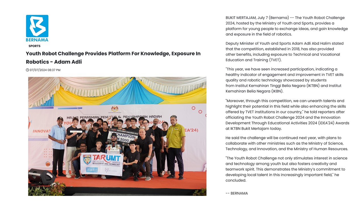 TAR UMT's Makers Club emerged as the Champion team at the Youth Robot Challenge 2024. TARCians also clinched the First Runner-up position too.