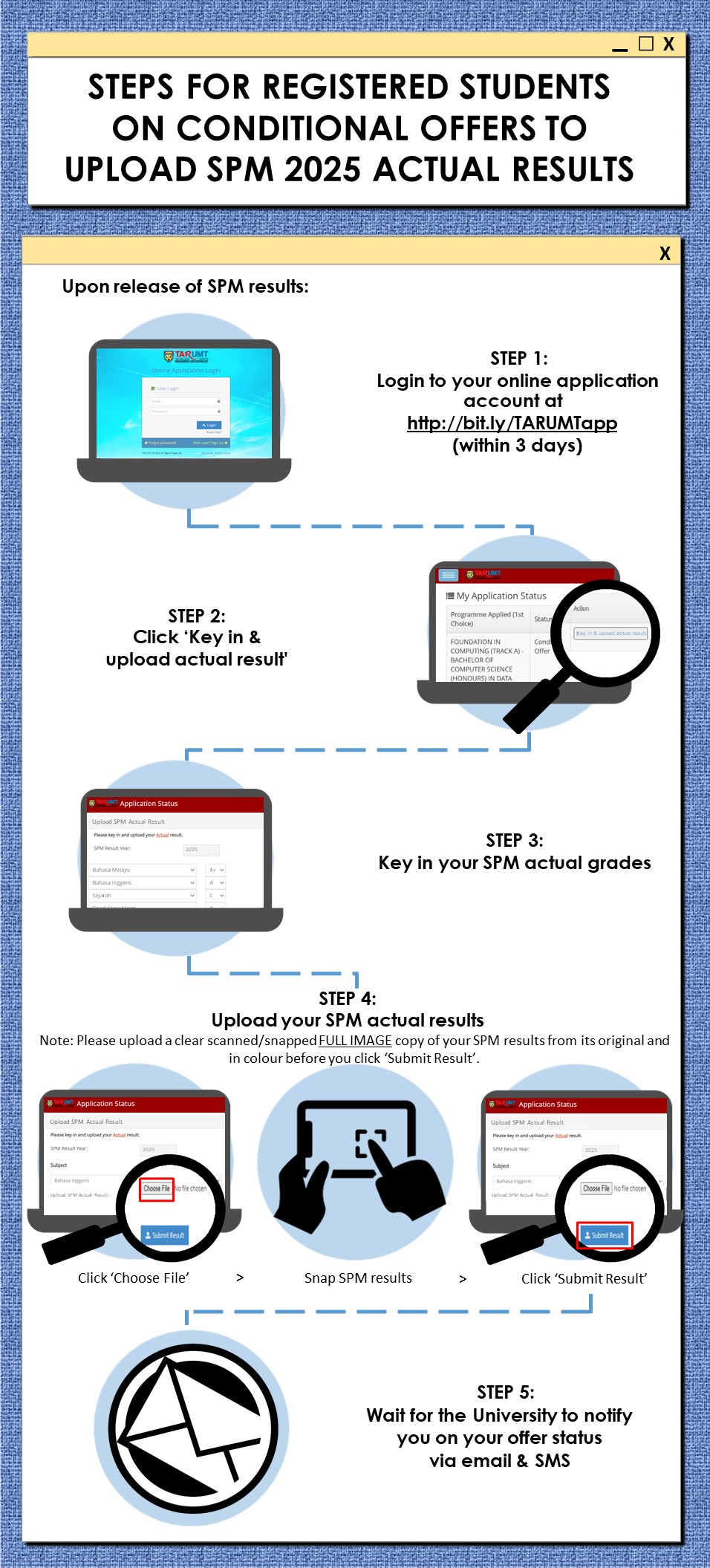 You must immediately log in to http://bit.ly/TARUCapps to key-in and upload your actual SPM results within 3 days from the date of their release.