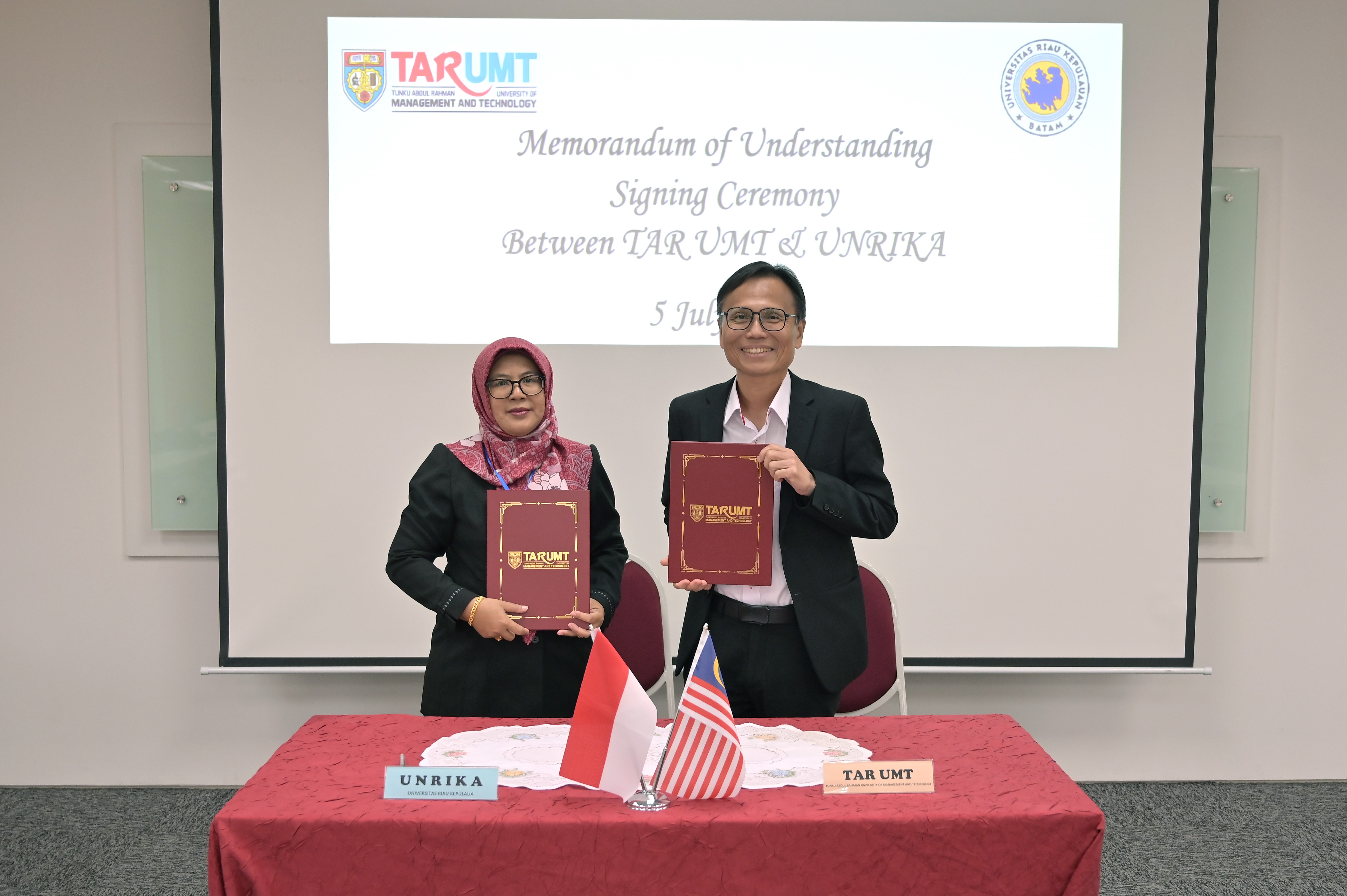 5 July 2024 Senior officials from UNRIKA visited TAR UMT on 5 July 2024 to explore potential collaboration opportunities. During the visitation, TAR UMT and UNRIKA signed a Memorandum of Understanding. Both institutions were agreed to develop, promote and cooperate with one another in various activities such as: sharing of academic knowledge and best practices; staff and student engagements; and fostering partnerships and long term relationships with one another.