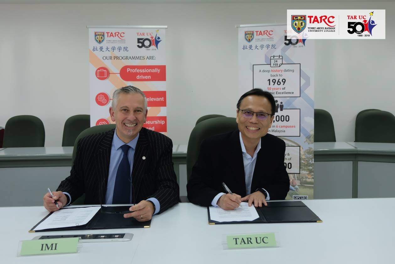 15 March 2019 The Memorandum of Agreement for Dual Award Collaboration between IMI and TAR UMT was signed on 15 March 2019. The Agreement was signed to further developing the existing collaboration between the two Universities, encompassing dual awards, student and staff mobility, joint research and other activities for the mutual benefit of the two Universities.