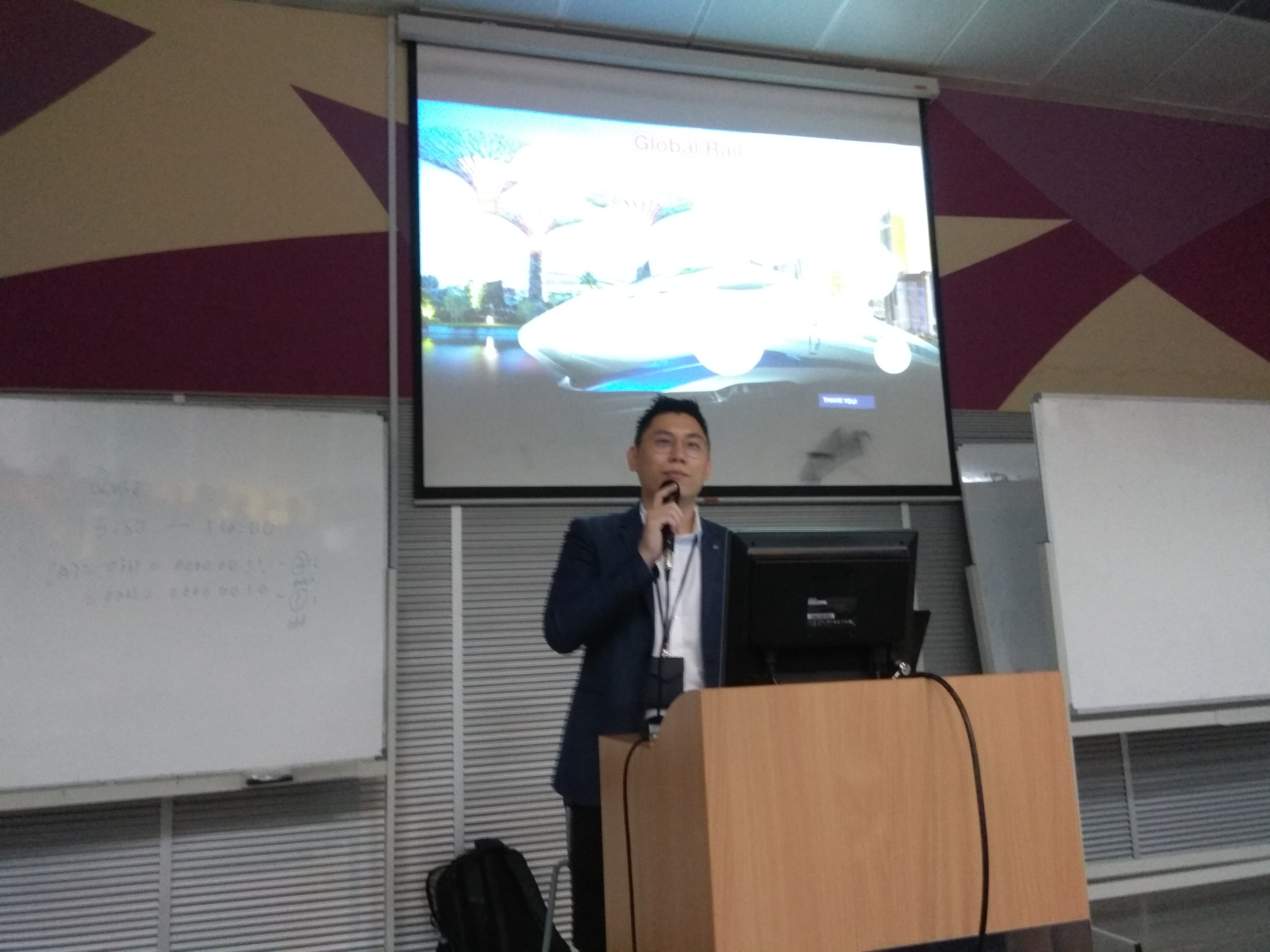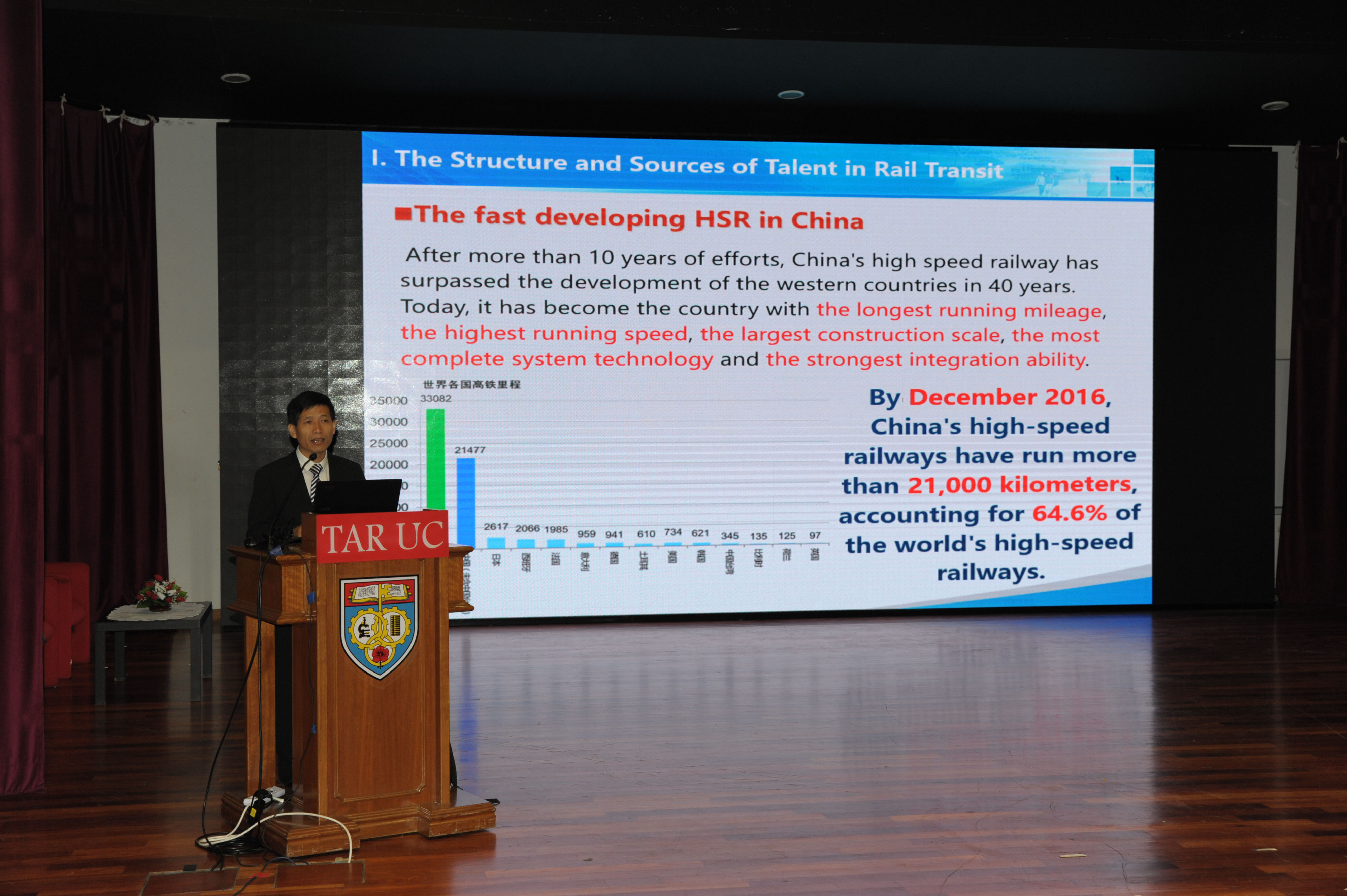 7 August 2018 On 7 August 2018, TAR UMT had co-organized the TAR UMT Railway Technology Forum 2018 for the railway related industries and students at Auditorium. The theme for the forum was 'Talent Development for Malaysia Railways Industry'. Around 160 participants attended the forum including around 30 external organizations. Mr. Teng Shiping from GRP was invited to give a talk in this forum with the title of “Introduction of EMU Maintenance Technology at Locomotive & Rolling Stock College”. He introduced the railway technologies taught in his polytechnic.