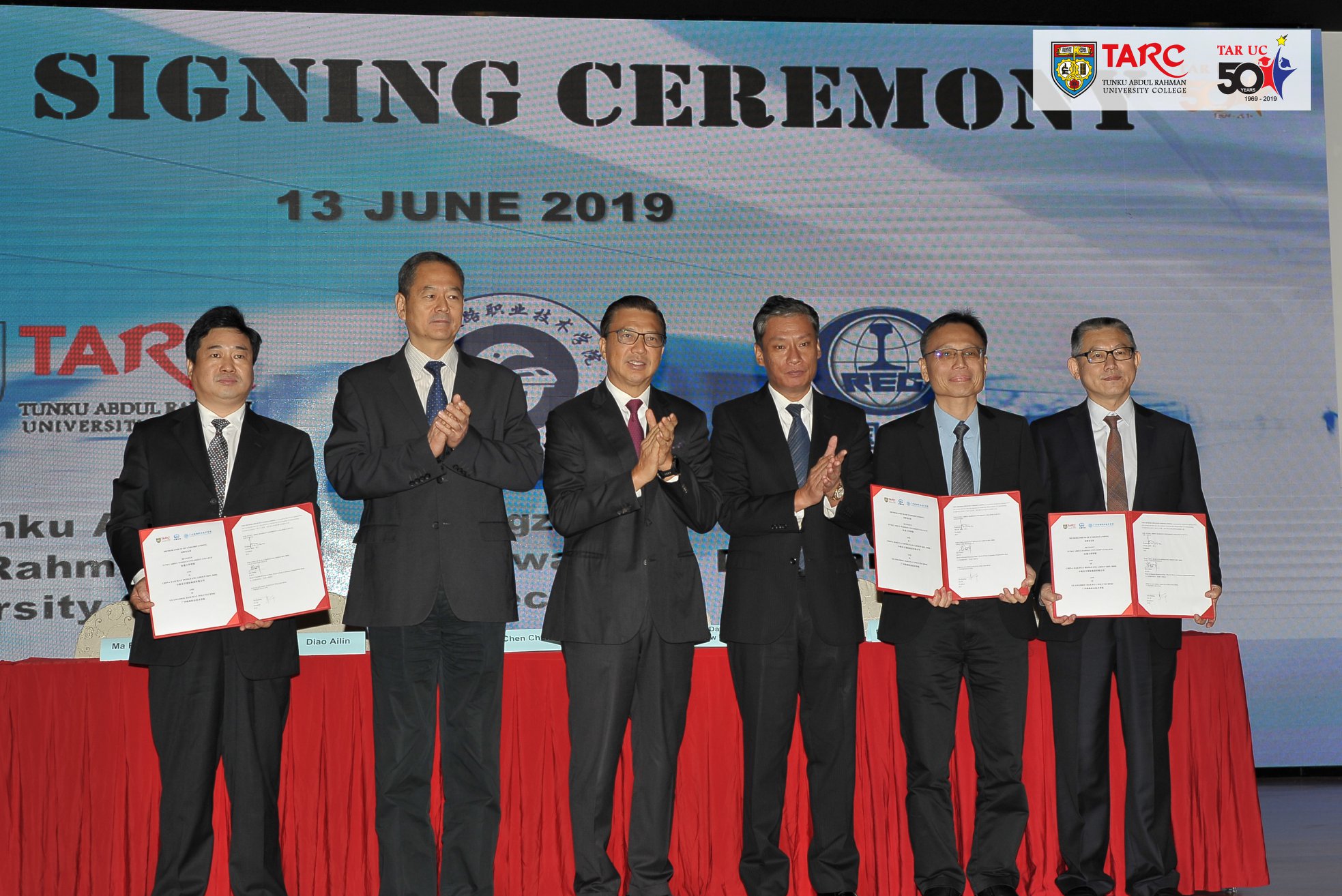 13 June 2019 TAR UMT formalised three strategic collaborations on 13 June 2019 with the aim to train TAR UMT Engineering students with specialised skills and knowledge for the railway industry. In a signing ceremony, TAR UMT signed a Memorandum of Agreement (MoA) with Guangzhou Railway Polytechnic (GRP) and Guangdong Zhuoyue Qiancheng Education Services (BF), as well as a Memorandum of Understanding (MoU) with GRP and China Railway Dongfang Group (CREC) and another MoU with GRP and China Railway Rolling Stock Corporation (CRRC) Railway Vehicles Sdn Bhd. TAR UMT’s MoA with GRP and BF will provide TAR UMT students who are studying either the Diploma in Mechanical Engineering, Diploma in Mechatronic Engineering or Diploma in Electronic Engineering the option to also pursue GRP’s Diploma in Railway Locomotive. In addition, the MoU with CRRC and CREC will provide internship and job placement opportunities for TAR UMT students who have opted to undertake GRP’s Diploma in Railway Locomotive.