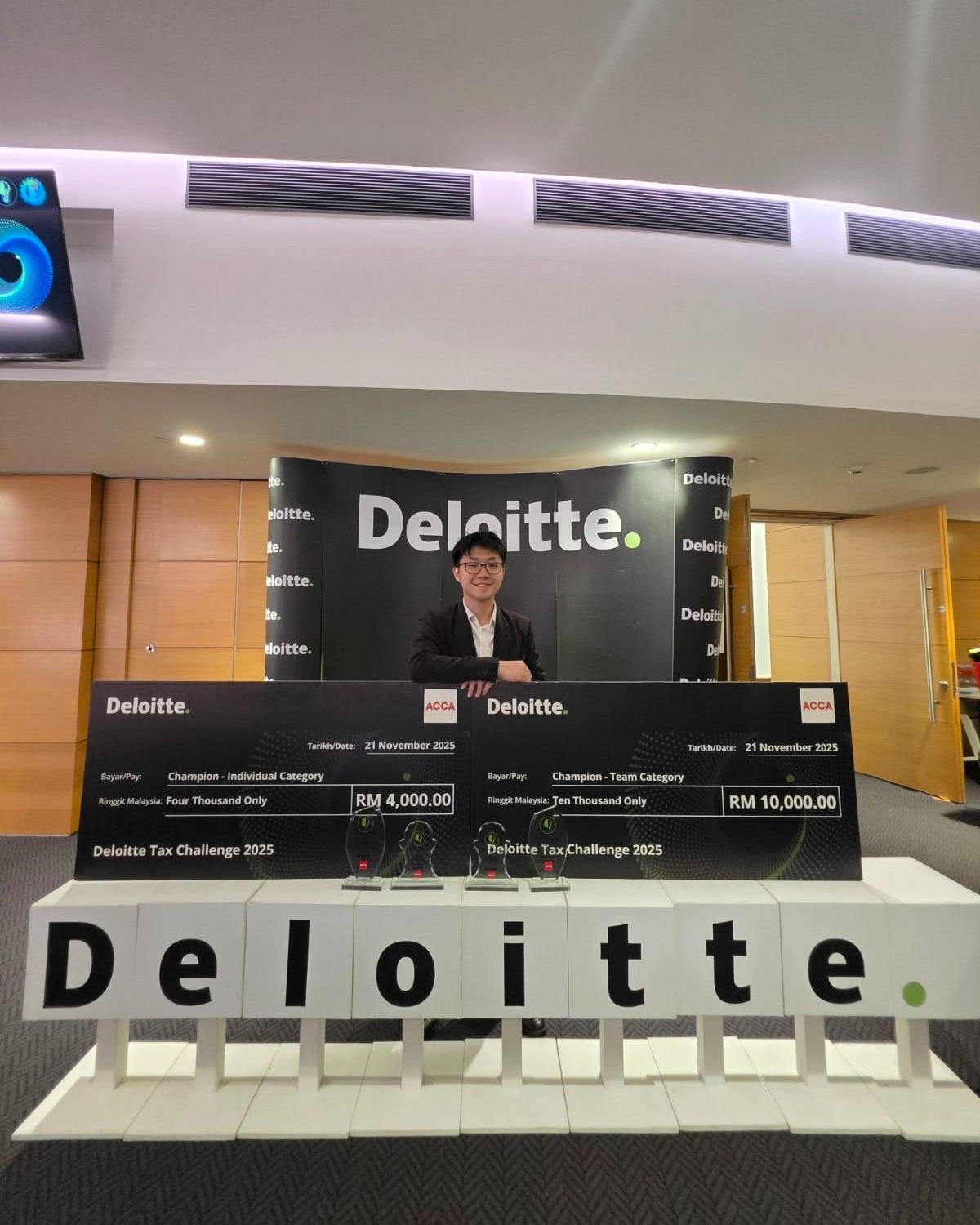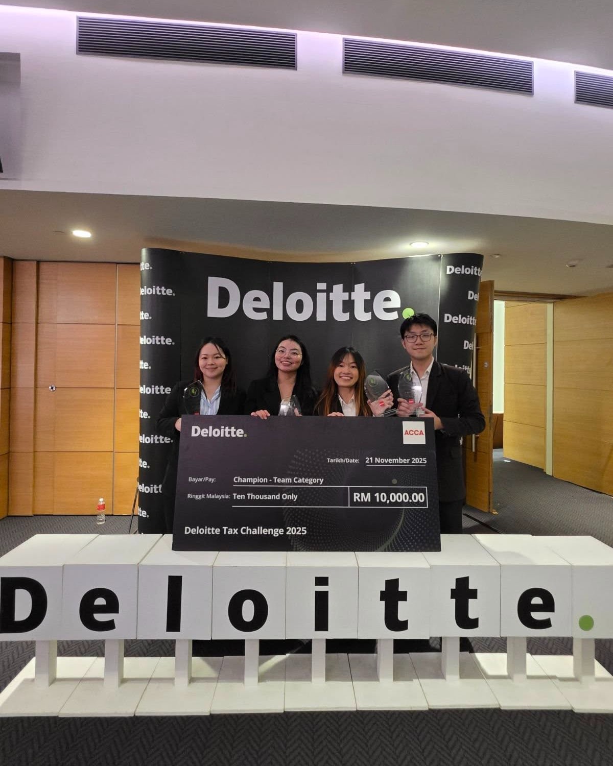 In the Deloitte Tax Challenge, Bachelor of Commerce (Hons) graduate Ng Yew Sheng clinched the Champion and Best Presenter titles in the Individual Category, while Lim Li Yuin and Karanjot Singh secured the Merit Prize. The Champion Team comprised Ng Yew Sheng, Lim Li Yuin, Koh Ching Nghi and Genevere Foo Wen Shun, with Yew Sheng and Ching Nghi awarded Best Presenters. Yew Sheng will represent the country in both the individual and team categories, while Ching Nghi will compete in the team category at the regional level of the competition.