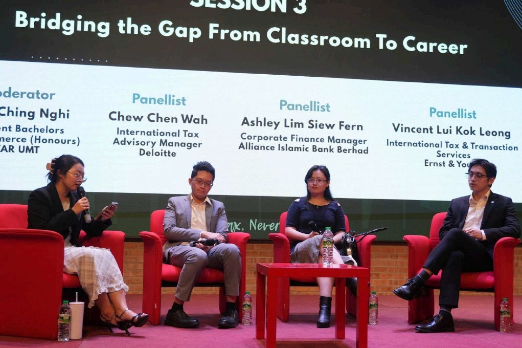 Moderator and panellists (from left): Ms Koh Ching Nghi, moderator and TAR UMT student pursuing her Bachelor of Commerce (Hons), Mr Chew Chen Wah (International Tax Advisory Manager and a TAR UMT alumnus), Ms Ashley Lim Siew Fern (Corporate Finance Manager of Alliance Islamic Bank Berhad and a TAR UMT alumna) and Mr Vincent Lui Kok Leong (International Tax & Transaction Service Senior Associate of Ernst & Young and a TAR UMT alumnus)